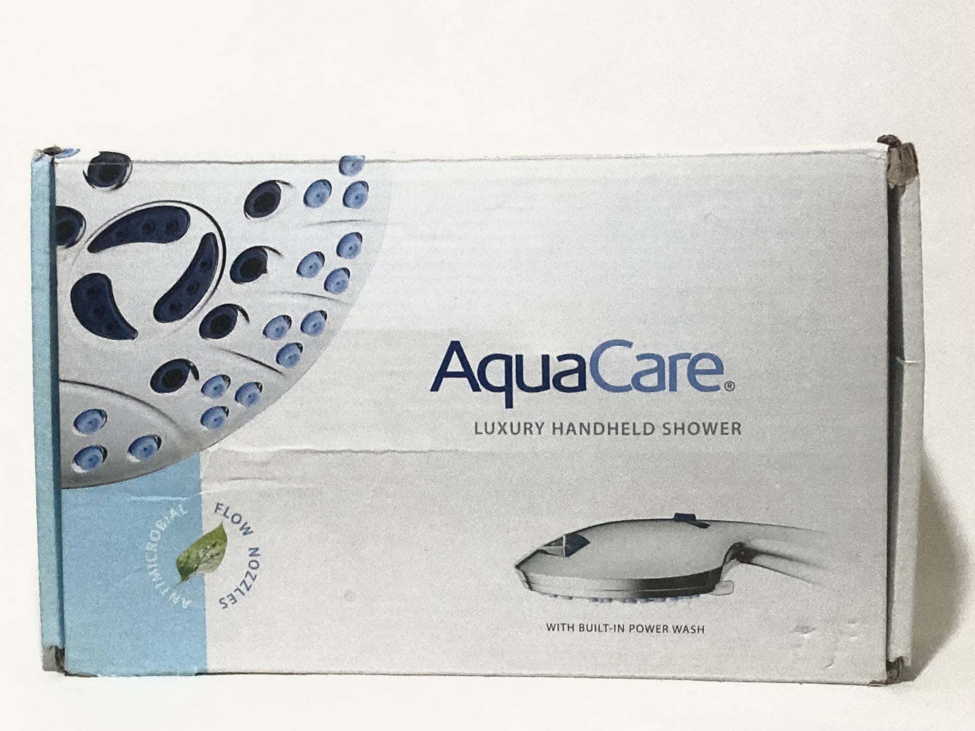 Experience an immersive shower experience with this AquaCare luxury handheld shower head. It includes a antimicrobial flow nozzle and a built-in power wash feature. 8 settings for optimum comfort. The box is a little damaged but this item has never been used.