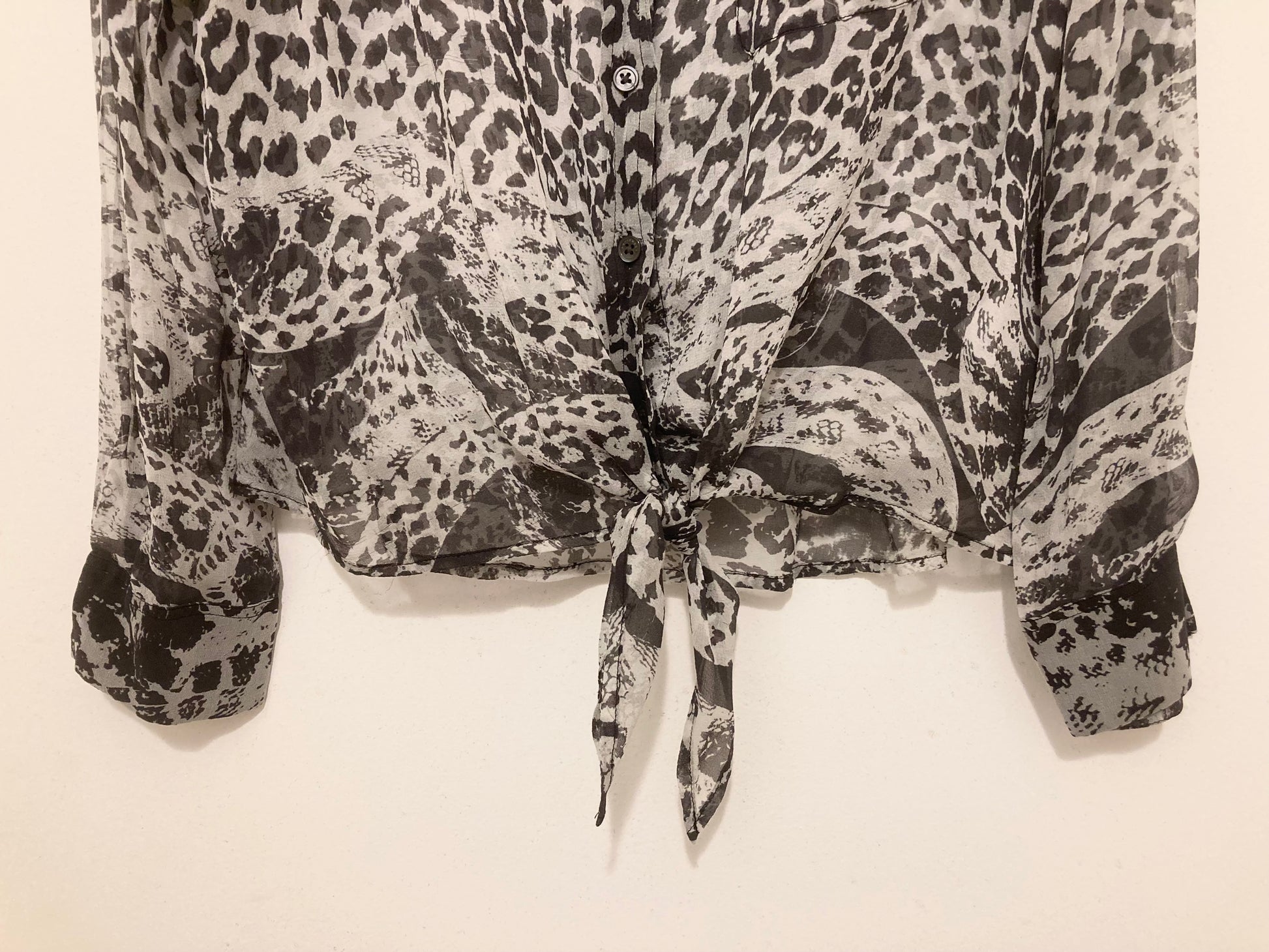 Sophisticated blouse with animal print design. Features a tie-front detail. Ideal for stylish outings.