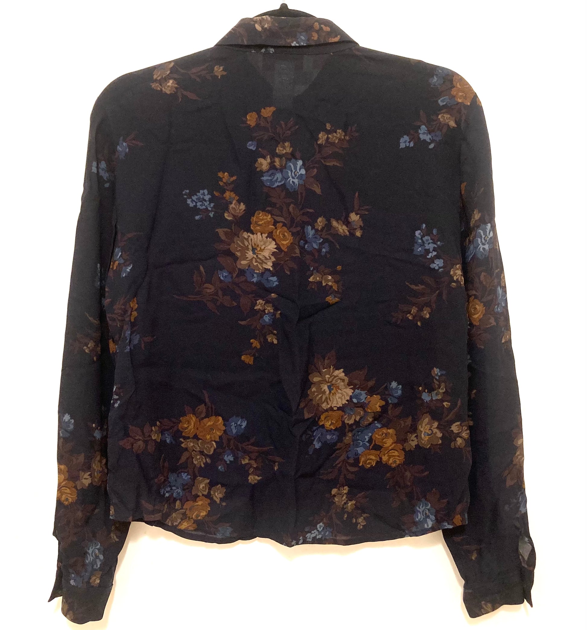 Elegant floral long sleeve top with a blend of blue and brown hues. Perfect for any occasion.