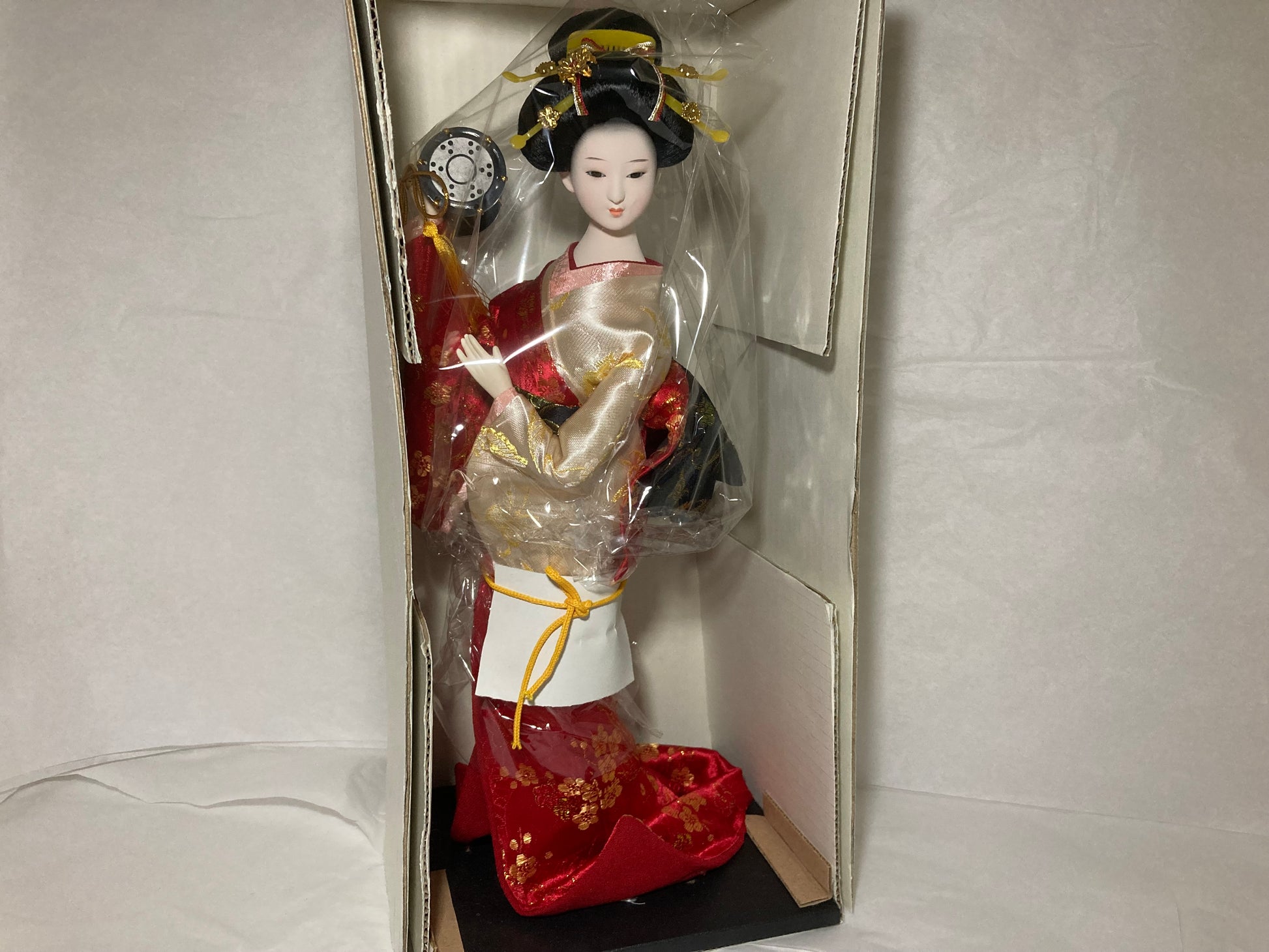Large Japanese Geisha Doll In Elegant Red and Gold Kimono New