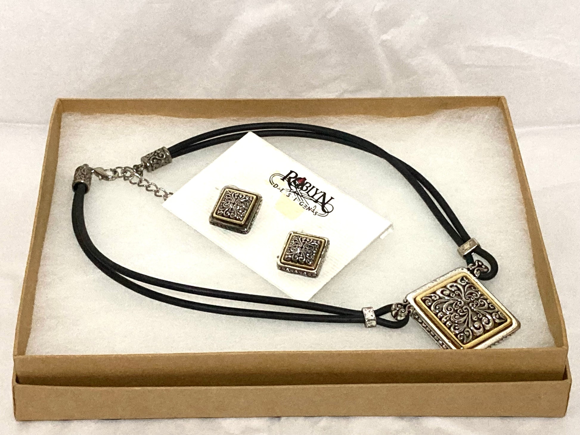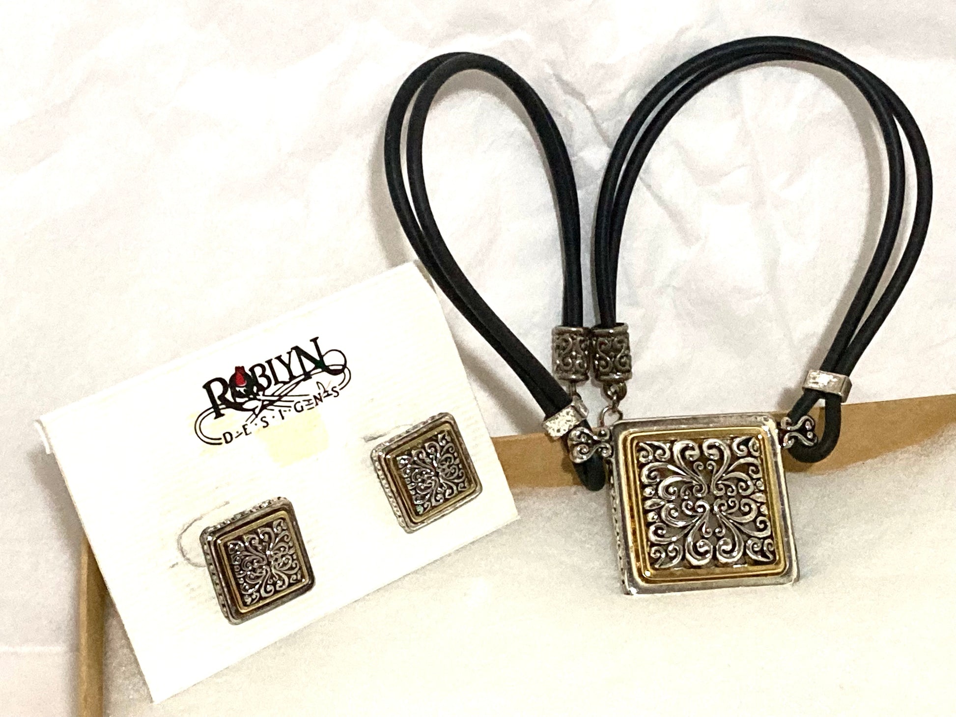 Roblyn Designs Black Necklace with Silver & Gold Pendant and Earring Set