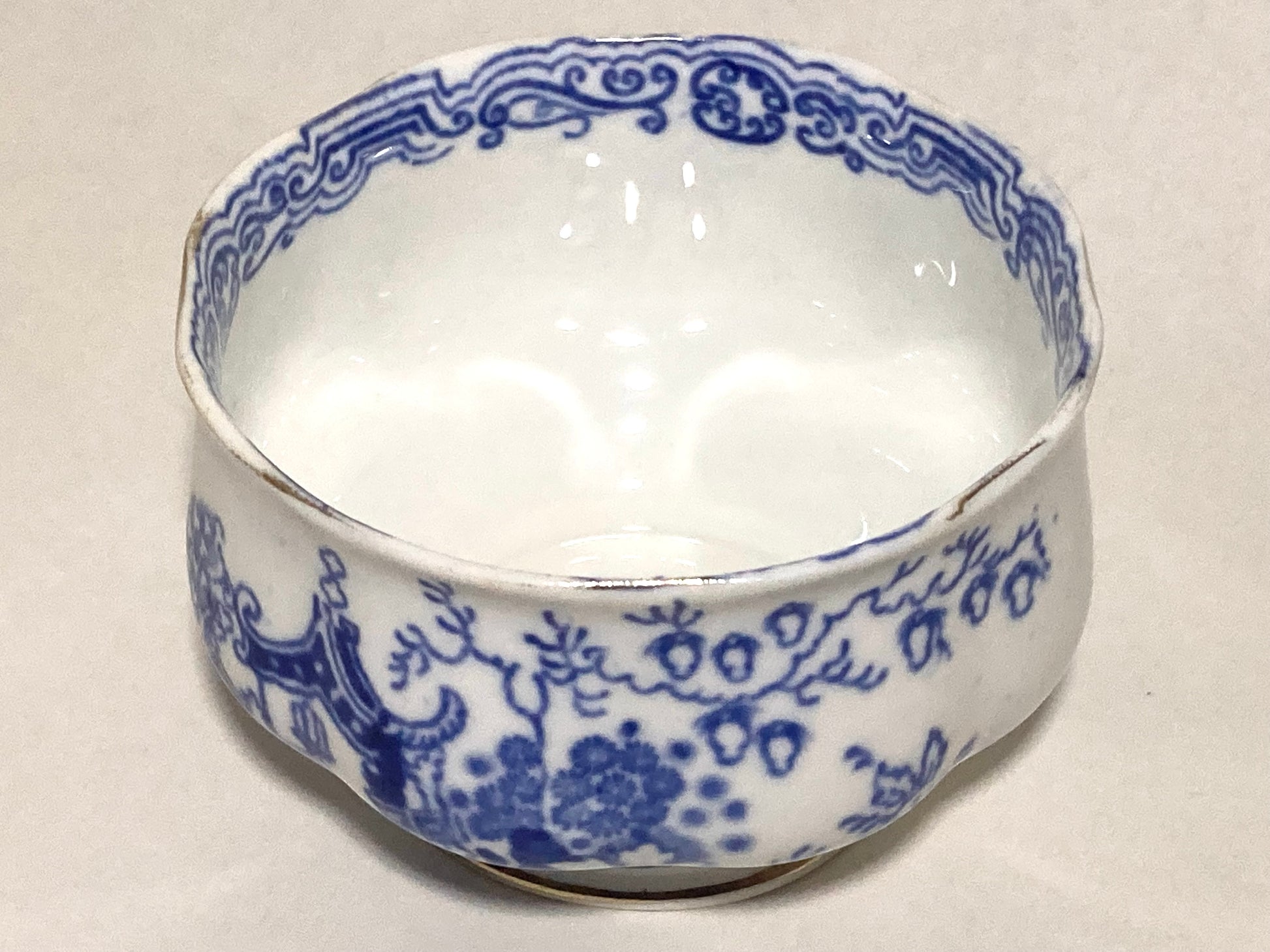 Small and charming bone china bowl with intricate blue designs and gold trim. Ideal for enhancing home decor. Made in England.
