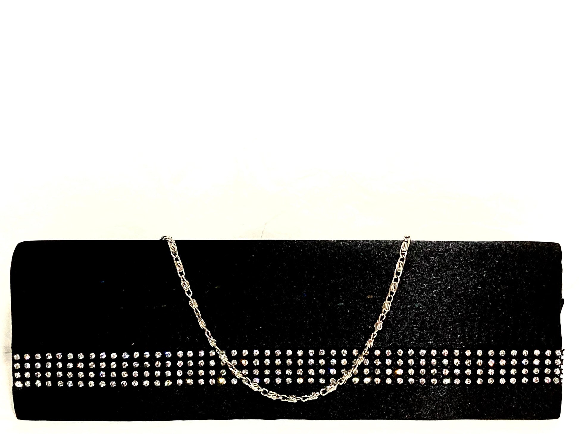 Sasha Satin Black Clutch with Crystal Accents & Silver Chain NWT