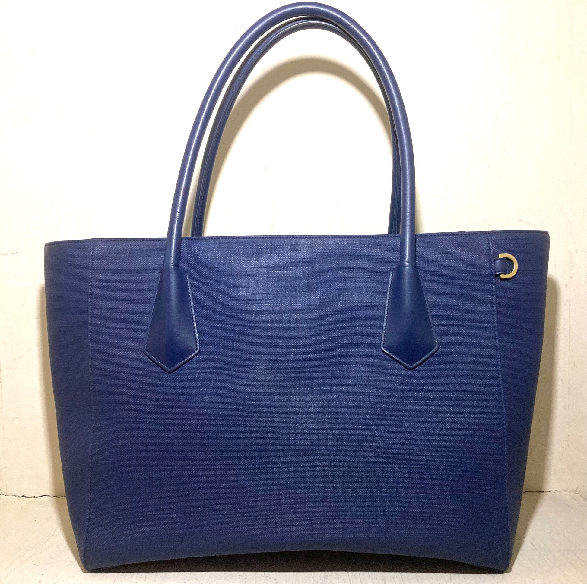 This navy blue tote bag features a structured design with a textured finish, offering both elegance and functionality. Its spacious interior and sturdy double handles make it ideal for professional and casual settings. The minimalist silhouette is complemented by subtle metal hardware, adding a touch of sophistication.