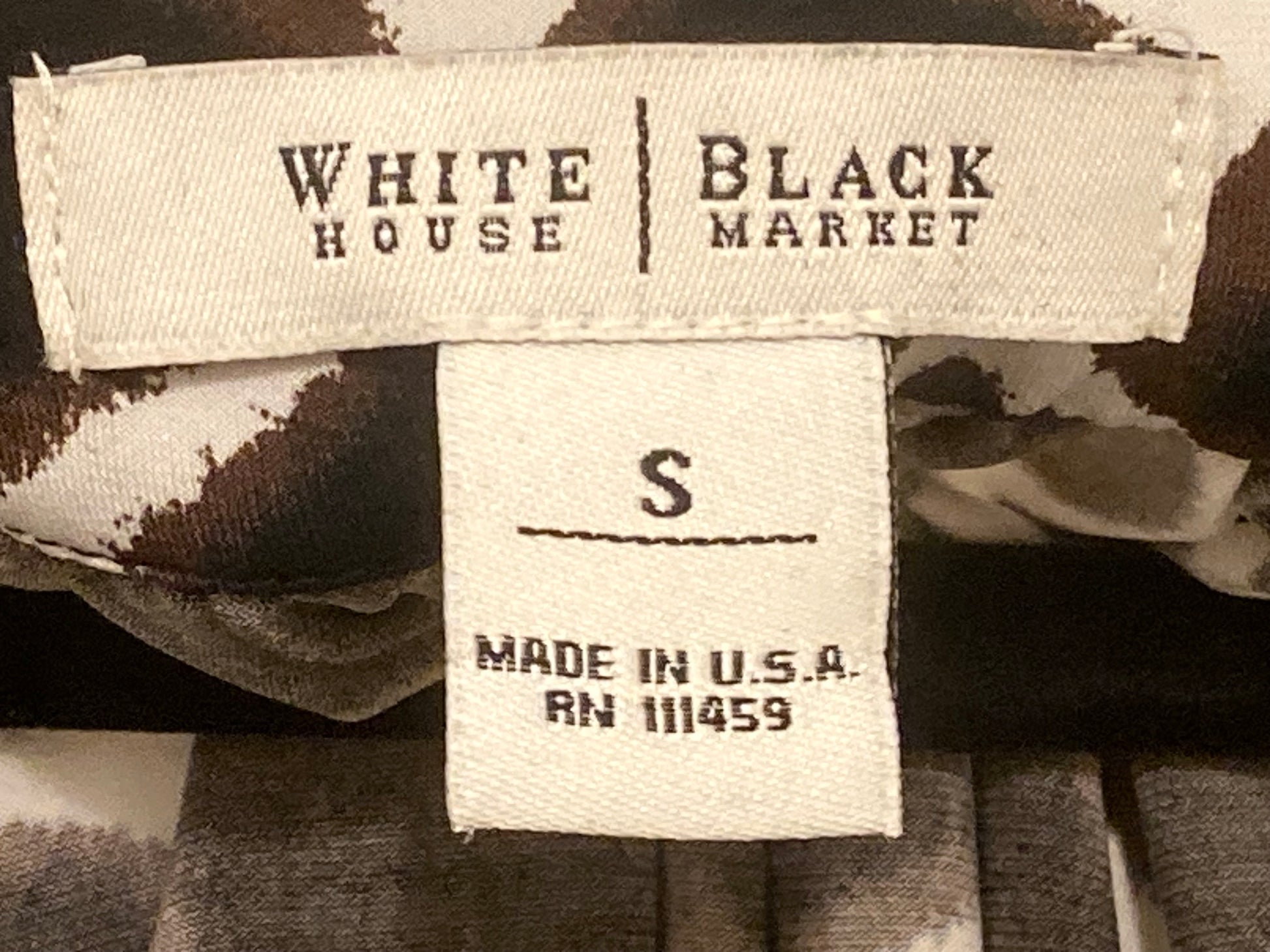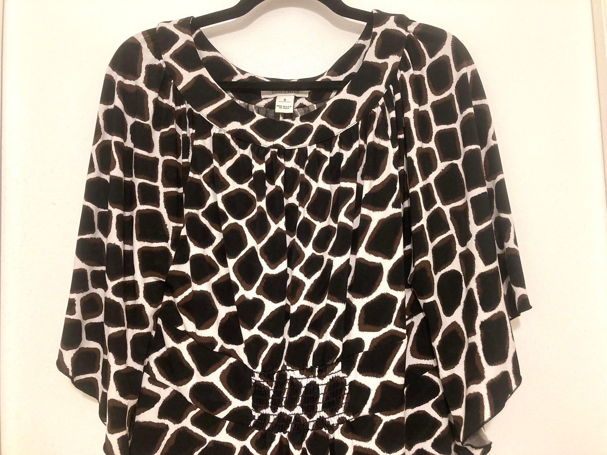Sophisticated geometric pattern. Flattering fit with gathered waist. Ideal for versatile styling.