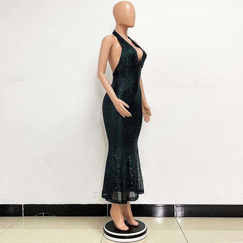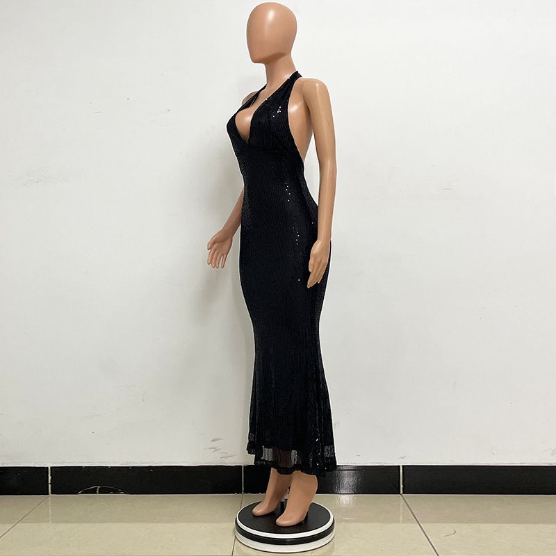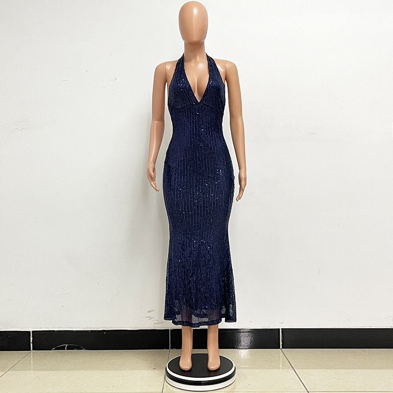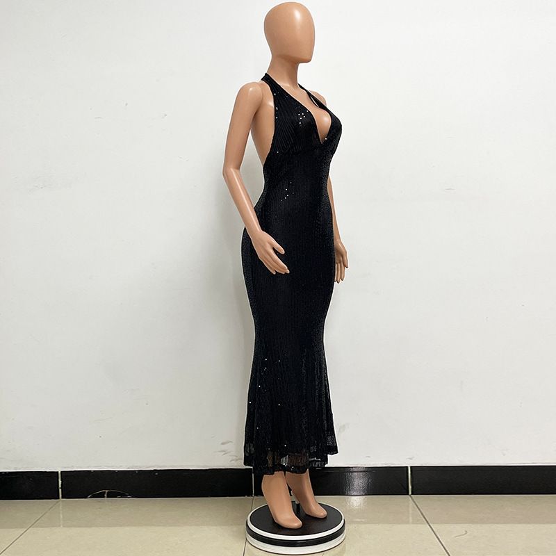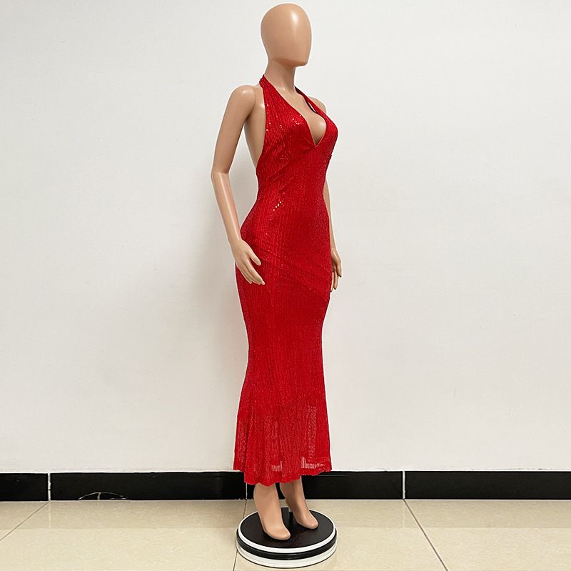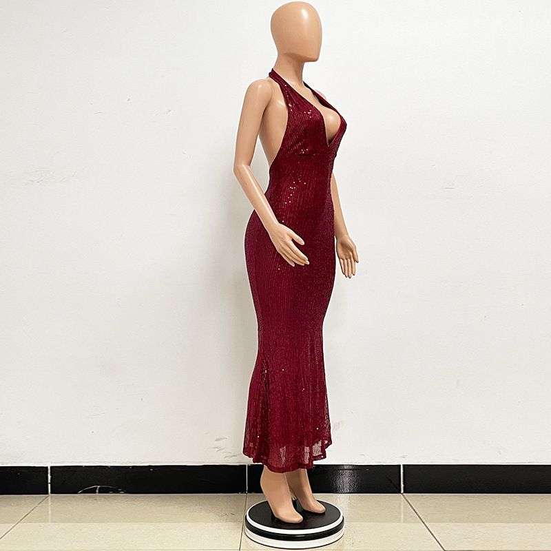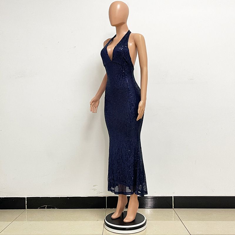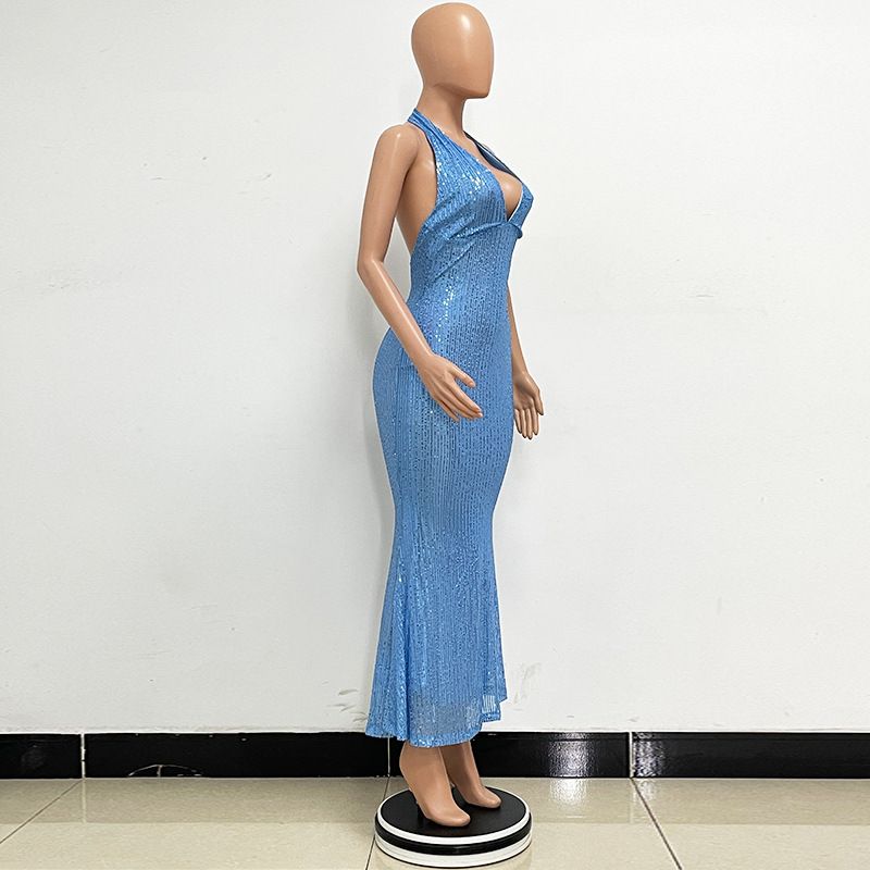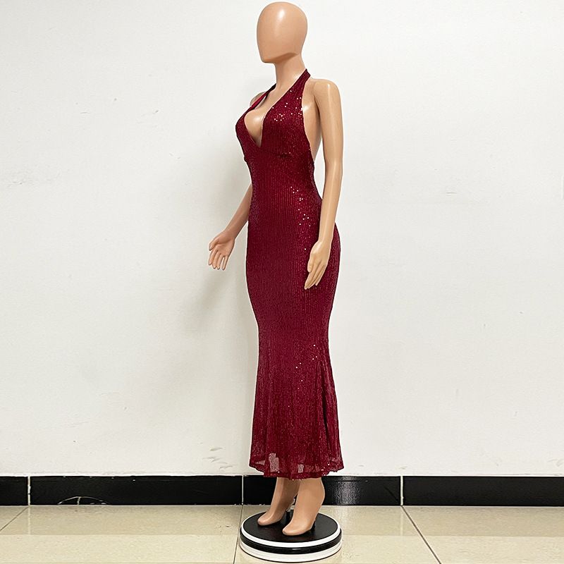 Women's Clothing Deep V Halter Neck Backless Dress Holiday Style Long Fishtail Dress