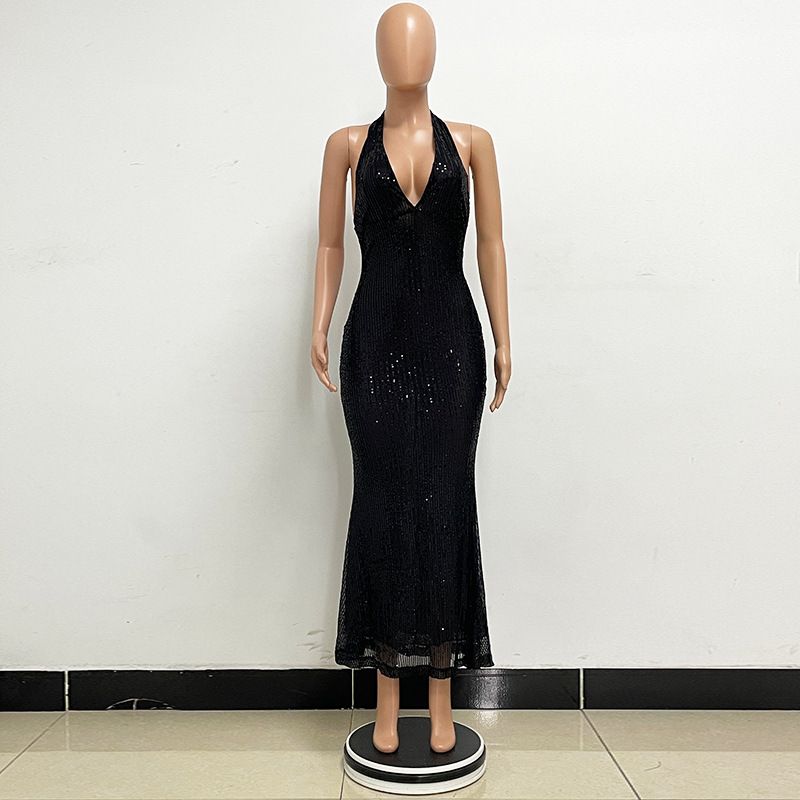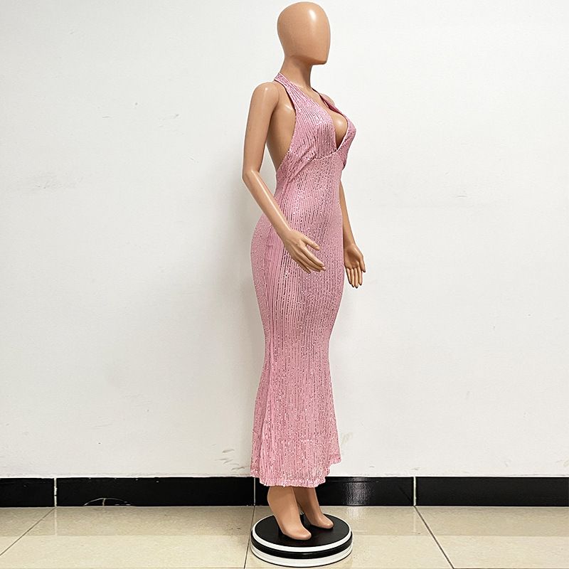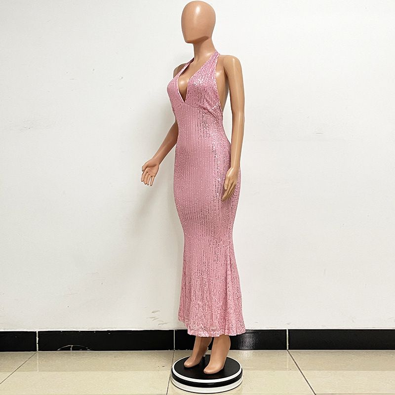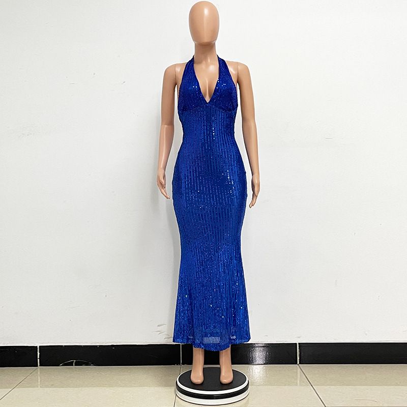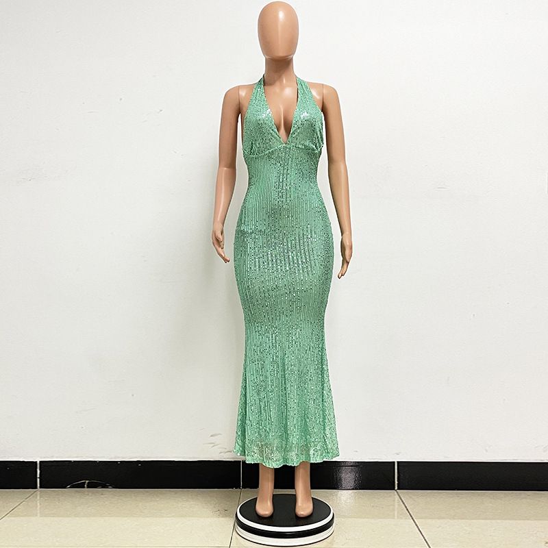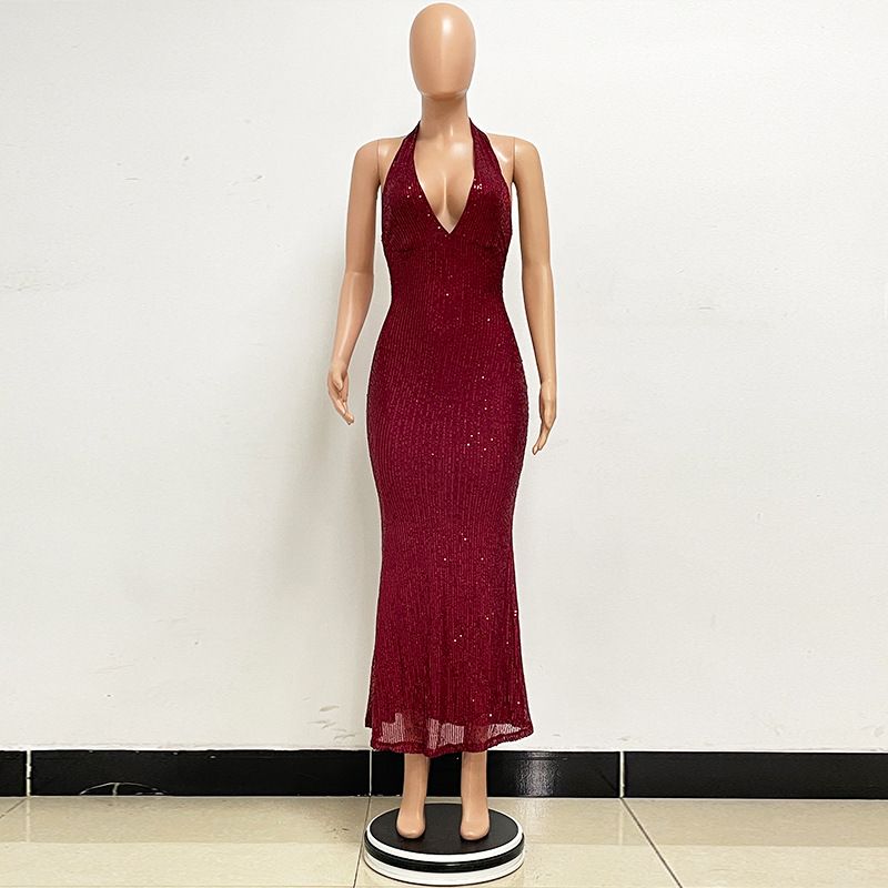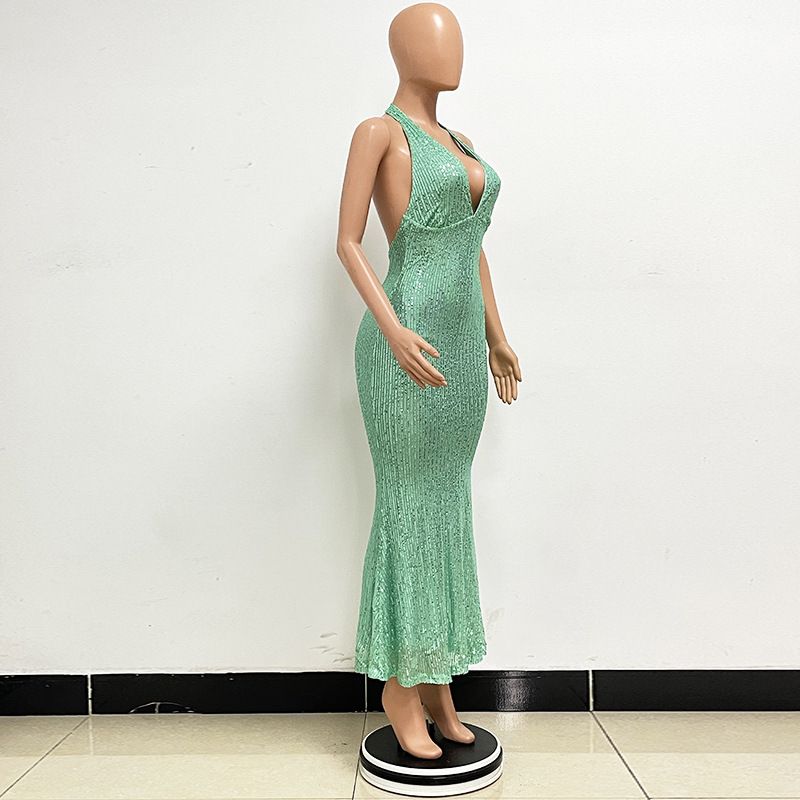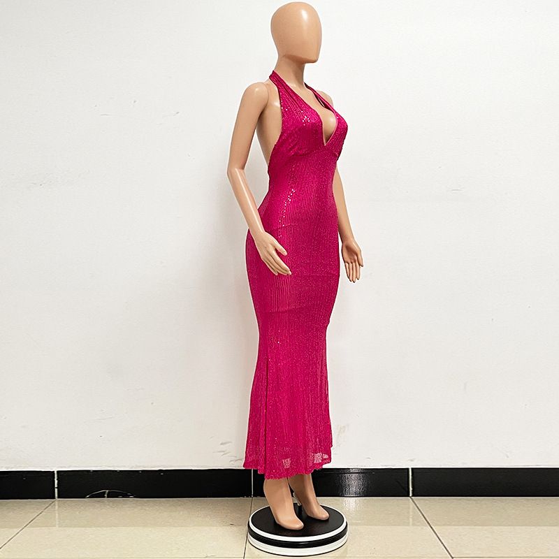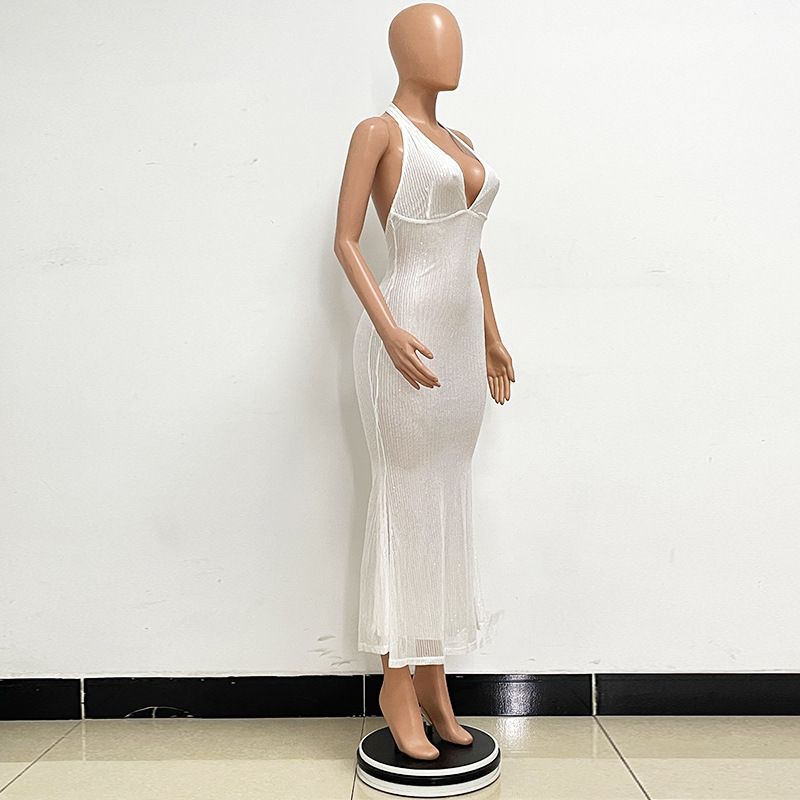 Women's Clothing Deep V Halter Neck Backless Dress Holiday Style Long Fishtail Dress